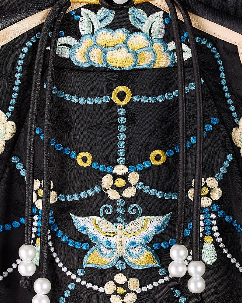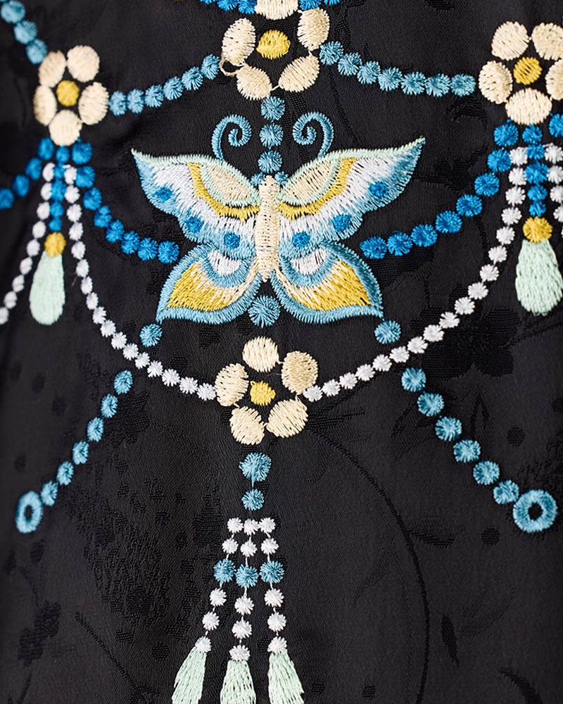 優雅な黒地のチャイナドレス。Aラインシルエットで両サイドのギャザー切り替えが美しい動きを演出。地模様入りの上質生地に、ベルスリーブの袖には蓮花の繊細な刺繍が施されています。演奏会やパーティ、特別なお出かけシーンで存在感を放つ一着。中国伝統美と現代デザインが融合した逸品チャイナドレスです。